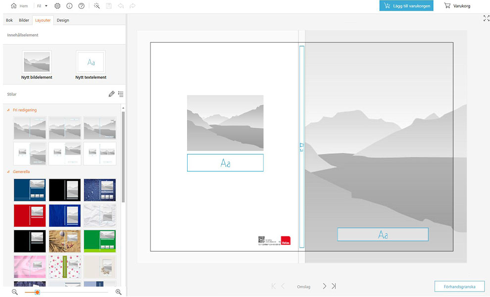 Nu finns det många alternativ för hur du kan börja skapa din fotobok. Du kan välja fritt bland våra anpassningsbara sidlayouter från avsnittet Layouts i det övre vänstra hörnet, eller välja en av de färdiga layouterna.