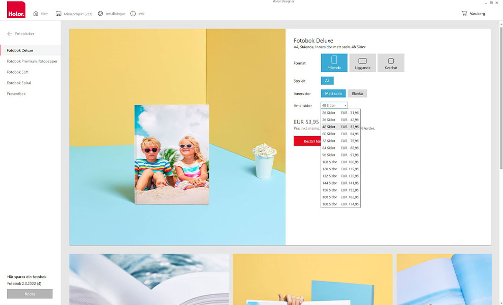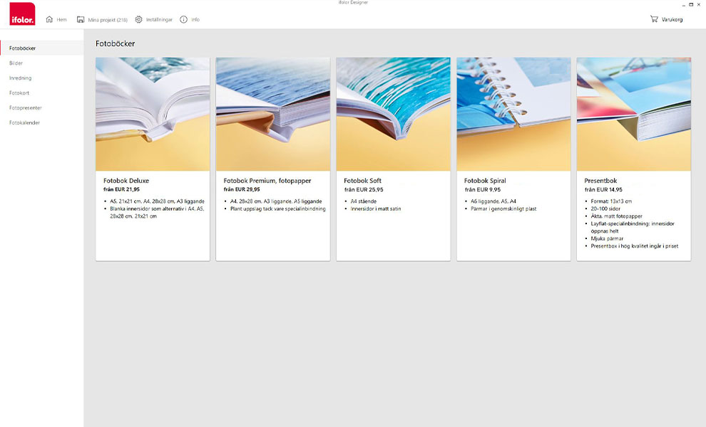 I Designer kan du välja vilken typ av fotobok du vill ha bland flera olika fotoböcker. Du kan välja en bok med hård eller mjuk pärm, en stor Fotobok Premium, en fotobok i praktisk storlek eller något däremellan. Det är smart att välja en fotoboksmodell som passar till temat för den fotobok du väljer. En Fotobok Spiral är till exempel perfekt för en receptbok, medan en Fotobok Deluxe passar bra som en sagobok för barn.