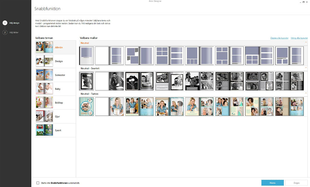 Du kanske redan har en viss stil som du vill ha i din fotobok ¬– och det är en bra start. Du kan skapa din bok på flera olika sätt: du kan välja en av Designers färdiga format för fotoböcker och låta programmet skapa boken åt dig, eller så kan du skapa en helt unik bok från grunden genom att bestämma alla aspekter av boken själv. Du kan använda de färdiga mallarna som redan innehåller bilder och platser för text. Med några få ändringar kan du använda de färdiga mallarna för att skapa en sida som ser ut precis som du vill!