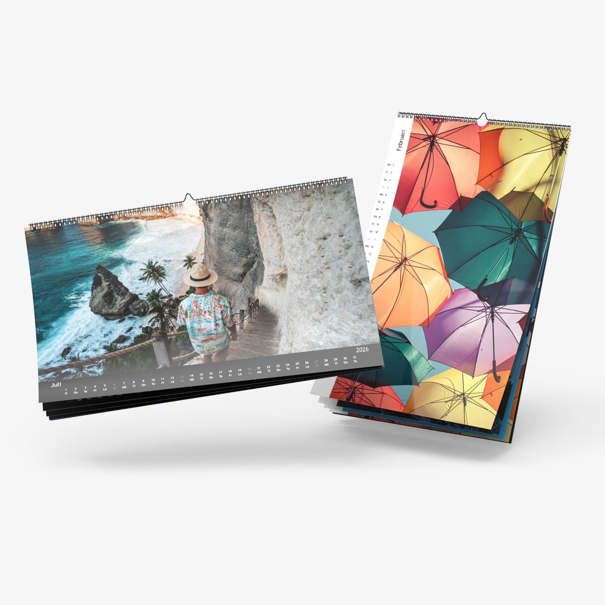 Njut av dina bästa bilder varje dag – beställ en egen spiralbunden liggande panoramakalender från ifolor! Du får plats för upp till 52 bilder på blanka papper. Vackra landskapsbilder i vidvinkel och snärtiga närbilder kommer verkligen till sin rätta i panoramakalendern.