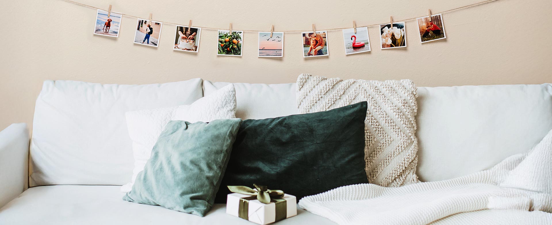 Bilder på ett klädstreck är en rolig idé för födelsedagar eller inflyttningsfester. Allt du behöver är: ifolors kvadratiska bilder eller retrobilder, jutesnöre, små klädnypor eller klämmor och en lämplig plats att hänga upp dina fotominnen på. Placera på väggen med ett par spikar eller häng från ena kanten av hyllan till en annan. Du får en mer imponerande fotovägg när du hänger bilder i olika lager.