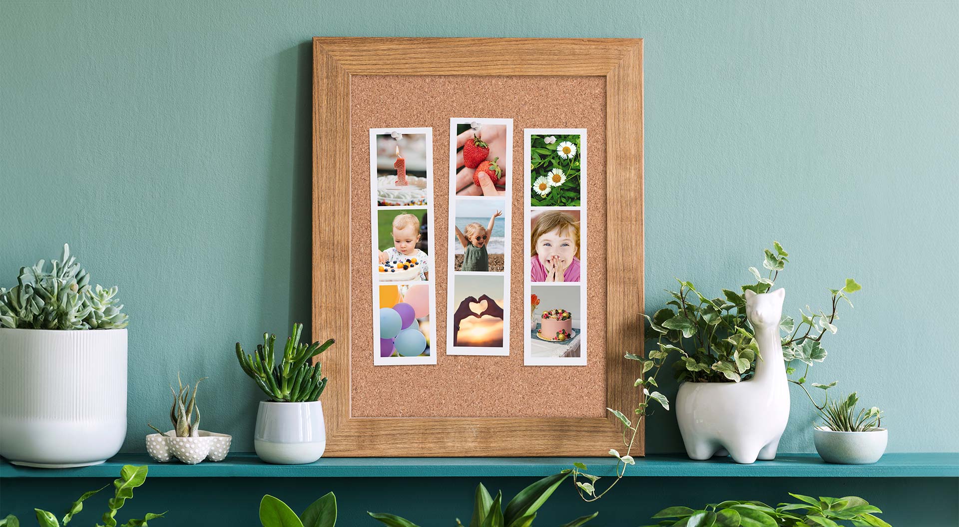 Det här kollaget fäst med tejp fungerar som ett blickfång när du bara behöver en tillfällig dekoration till en fest. För en överraskningsfest är den här idén perfekt för att överraska födelsedagsbarnet! Du kan beställa de kvadratiska bilderna med eller utan vit kant, och 24 bilder räcker för att göra ett stort hjärta. När kalaset är slut kan bilderna packas tillbaka i sin egen låda och ges som present till födelsedagsbarnet.