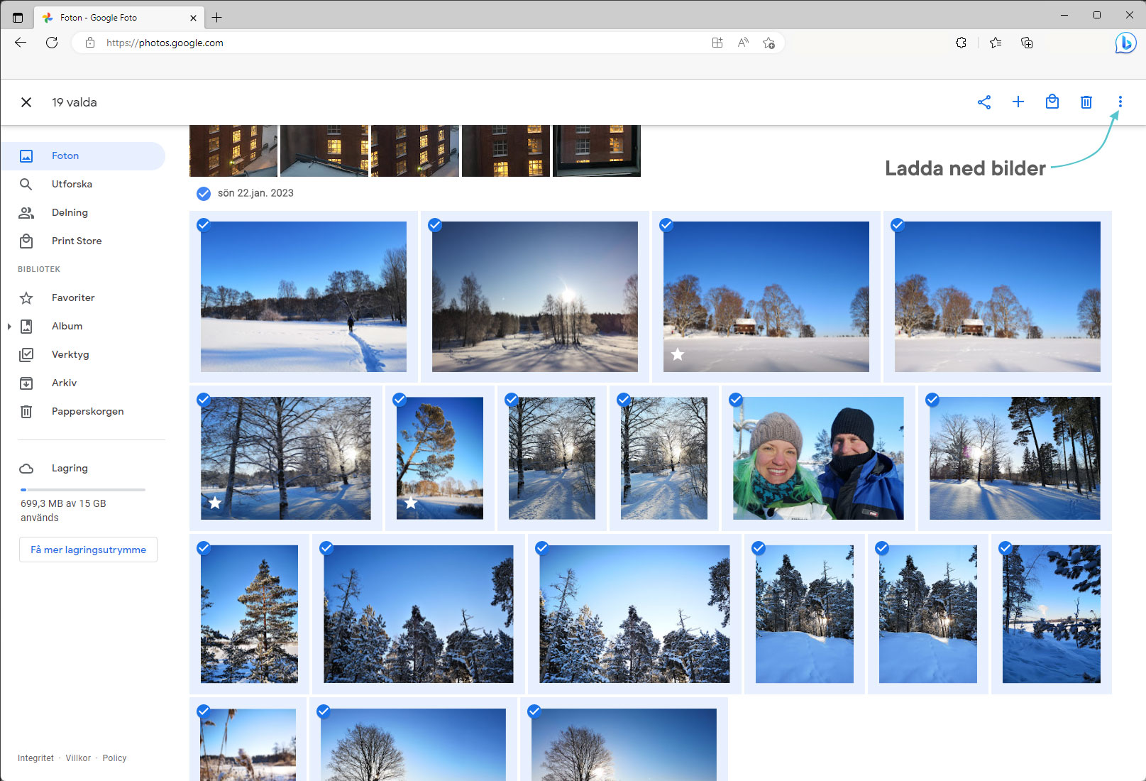 - Välj de bilder som du vill överföra och Ladda bilder. (Ladda-knappen hittar du under de tre prickarna i det övre högra hörnet).